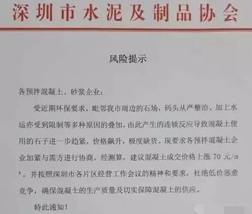 受近期商品混凝土原材料(碎石、砂)持續(xù)漲價的影響,深圳市水泥及制品協會終于發(fā)布商品混凝土、預拌砂漿企業(yè)風險提示函,表示,因原材料價格持續(xù)上漲,商品混凝土價格建議,上調70元/立方米。目前,深圳市及周邊地區(qū)大多數混凝土企業(yè)混凝土價格已經上調,瘋狂的石頭再次上演【漲、漲、漲】何時能夠穩(wěn)定一來,還有待觀望。