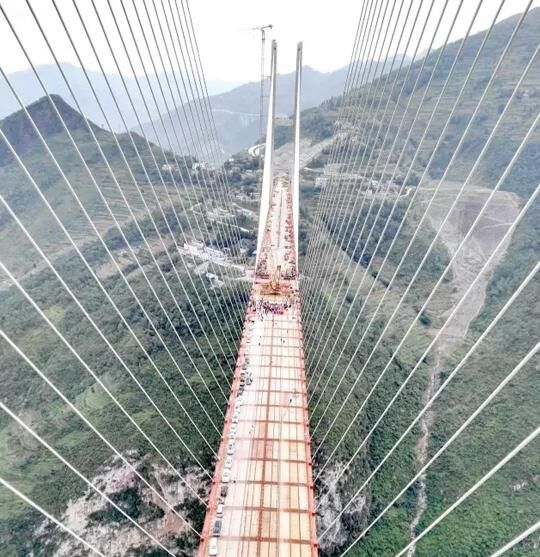 大橋為七跨連續(xù)鋼桁梁斜拉橋,全長1341.4米,主跨達到720米,在鋼桁梁斜拉橋中跨度排名世界第二。如此高的高度,如此龐大的橋體,能橫亙在大峽谷兩岸而穩(wěn)如泰山,橋上的斜拉索體系起著至關重要的作用。
