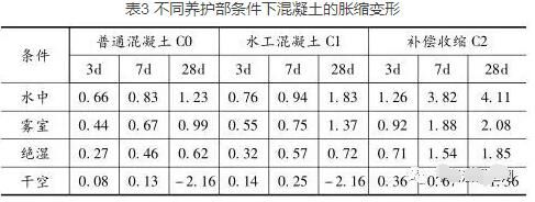 脹縮變形是混凝土的一項(xiàng)重要性質(zhì),不同的濕度條件和水分會(huì)對(duì)混凝土的脹縮變形造成不同的影響。我們通過不同的養(yǎng)護(hù)條件所造成的結(jié)果不同的現(xiàn)象,來探究濕度和水分對(duì)混凝土脹縮變形的影響(見表3)。