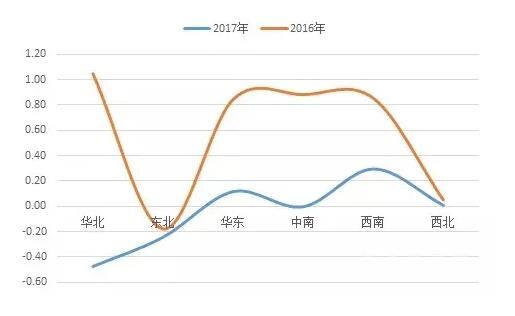圖2:2016、2017年六大區(qū)域?qū)θ珖喈a(chǎn)量增速貢獻的百分點