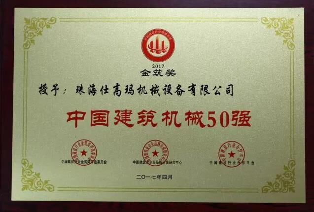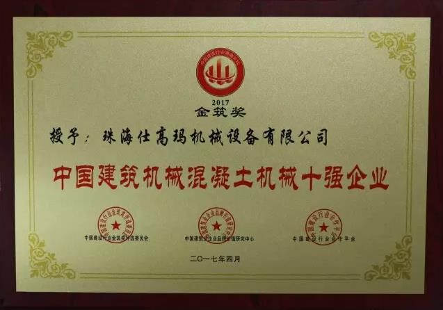 近日,“2017中國建設(shè)行業(yè)領(lǐng)袖峰會”暨2016年度“金筑獎”頒獎盛典在北京召開,珠海仕高瑪機械設(shè)備有限公司在2016年全國建筑業(yè)“金筑獎”評選活動中,榮獲“中國建筑機械50強”、“中國建筑機械混凝土機械十強企業(yè)”稱號。