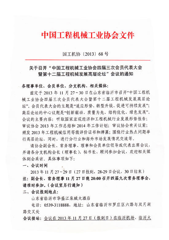 關(guān)于召開(kāi)“中國(guó)工程機(jī)械工業(yè)協(xié)會(huì)四屆三次會(huì)員代表大會(huì)”會(huì)議的通知