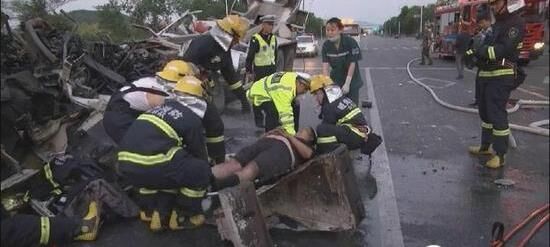 由于駕駛室變形嚴(yán)重,救援難度較大,為全力救出被困者,消防官兵首先利用擴(kuò)張器從左側(cè)車門擴(kuò)張,而后用撐頂桿對(duì)壓住被困者的變形車窗中間部位一點(diǎn)一點(diǎn)進(jìn)行擴(kuò)張,并小心翼翼地挪動(dòng)被困者的身體,發(fā)現(xiàn)車門位置已經(jīng)變形卡主被困人員,現(xiàn)場指揮員果斷命令用無齒鋸對(duì)車門部位切割并用戰(zhàn)斗服蓋住被困人員防止?fàn)C傷,水槍一直保持充實(shí)水柱狀態(tài)。