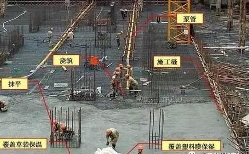 6、大體積泵送混凝土經(jīng)振搗后表面水泥漿較厚,容易引起表面裂縫。首先,要求在振搗最上一層混凝土?xí)r,控制振搗時間,注意避免表層產(chǎn)生太厚的浮漿層;在澆搗后,必須及時用2m 長括尺,將多余浮漿層刮除,按照標(biāo)高控制點,將混凝土表面括拍平整。有凹坑的部位必須用混凝土填平,在混凝土收漿接近初凝時,混凝土面進行二次抹光,用木蟹全面仔細打抹兩遍,既要確?;炷恋钠秸龋忠哑涑跗诒砻娴氖湛s脫水細縫閉合,在混凝土收漿凝固施工期間,除了具體施工人員外,不得在未干硬的混凝土面上隨意行走,收漿工作完成的面必須同步及時覆蓋薄膜。