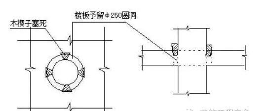 ③.樓板處留洞固定泵管如下圖。在首層及其它樓層頂板予留直徑250mm的圓洞便于穿管。管周圍用木楔楔緊,不少于四個。