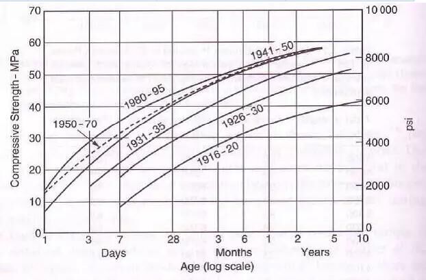 現(xiàn)在水泥與100年前水泥不相同大了去了?,F(xiàn)有很多高強水泥可采用高C3S、低C2S,高細(xì)度的方式實現(xiàn)早期高強目標(biāo)。盡管使用“高強水泥”可以降低規(guī)定強度的水泥用量、加快拆模、加速工程進度而使建設(shè)總承包方獲取豐厚利益,但是高水膠比和低水泥用量容易導(dǎo)致混凝土的滲透性較高,一般耐久性較差。過高早期強度和過早放棄模板的有效養(yǎng)護同樣對工程質(zhì)量產(chǎn)生安全隱患。