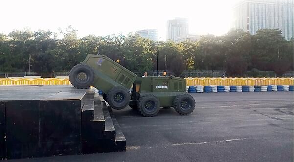 在翻越障礙物的過程中,車體姿態(tài)靈活變化,輕松攀越高臺,現(xiàn)場驚嘆與掌聲不斷。