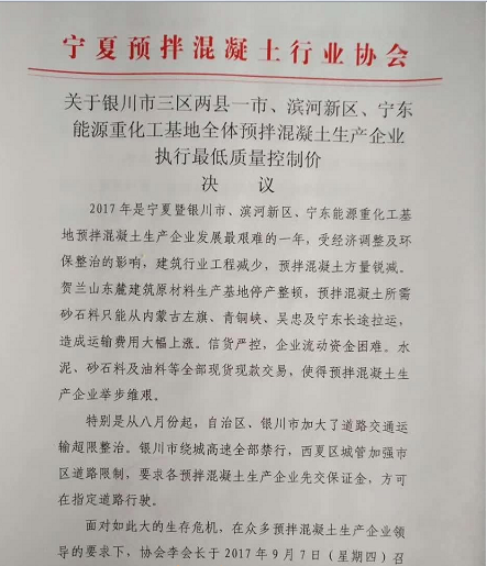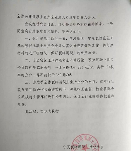 面對如此大的生存危機,寧夏混凝土協(xié)會于9月7日召開了銀川市三區(qū)兩縣一市、濱河新區(qū)、寧東能源重化工基地全體預拌混凝土生產(chǎn)企業(yè)法人及主要負責人會議。會議一致同意實行最低質量控制價。預拌混凝土供應價格以標號C30為例,一律不得低于330元/方,實行17%稅率的企業(yè)一律不能低于360元/方,以切實保證當?shù)仡A拌混凝土質量。