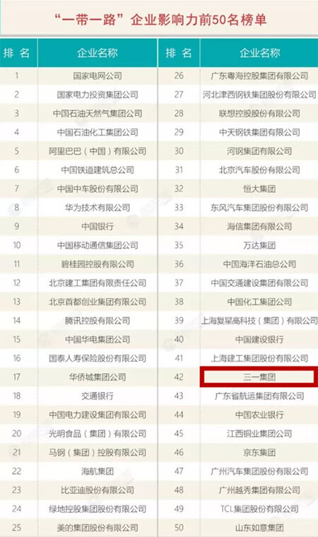 近日,國家信息中心發(fā)布了《”一帶一路”大數(shù)據(jù)報告(2017)》,首次評選出“一帶一路”企業(yè)影響力50強榜單,三一集團(tuán)排名第42位。