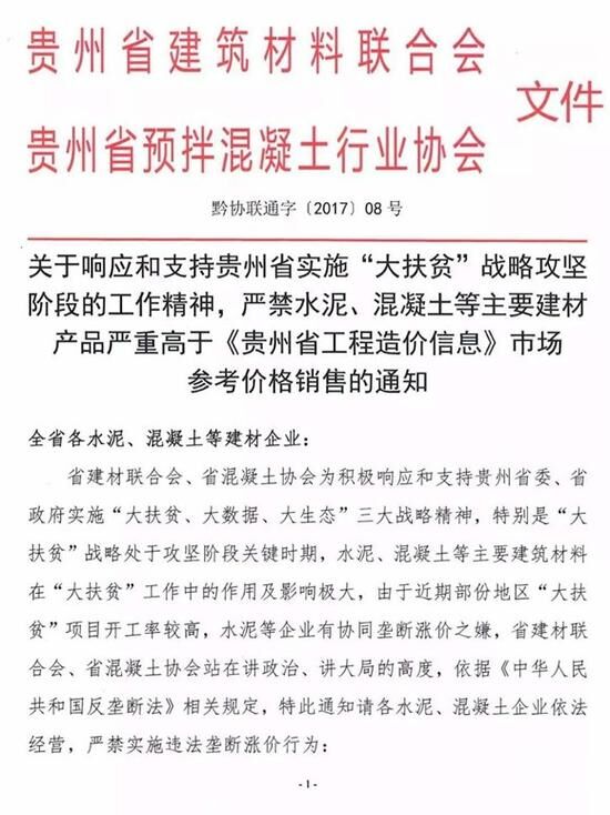 12月5日,貴州省建筑材料聯(lián)合會(huì)和貴州省預(yù)拌混凝土行業(yè)協(xié)會(huì)聯(lián)合發(fā)文《關(guān)于響應(yīng)和支持貴州省實(shí)施“大扶貧”戰(zhàn)略攻堅(jiān)階段的工作精神,嚴(yán)禁水泥、混凝土等主要建材產(chǎn)品嚴(yán)重高于<貴州省工程造價(jià)信息>市場參考價(jià)格銷售的通知》(黔協(xié)聯(lián)通字〔2017〕08號)(下文稱為《通知》)。