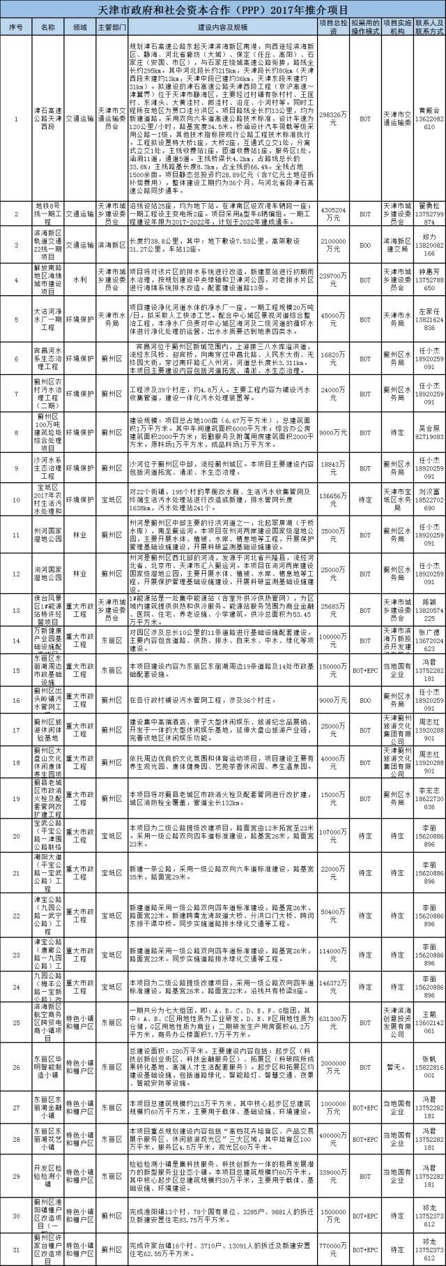 天津市發(fā)改委推介31個(gè)PPP項(xiàng)目,總投資1469億元,涉及交通運(yùn)輸、水利、環(huán)境保護(hù)、林業(yè)、重大市政工程和特色小鎮(zhèn)及棚戶(hù)區(qū)六個(gè)領(lǐng)域,其中與基建相關(guān)的23個(gè),投資超1438億元。