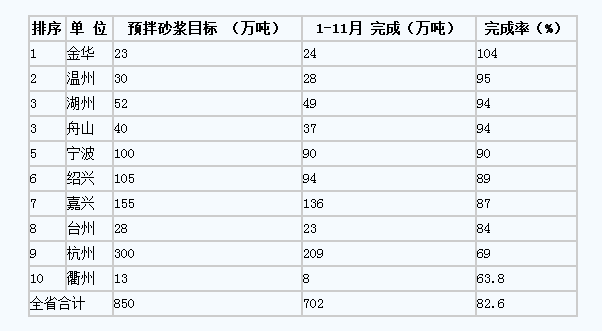 1-11月,杭州等10市預(yù)拌砂漿全年目標任務(wù)完成情況如下:
