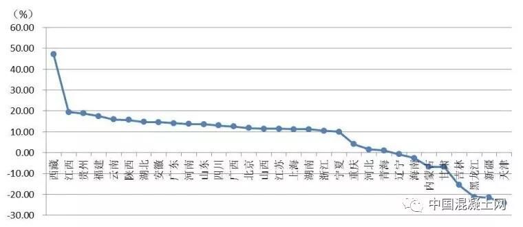 從各地區(qū)建筑業(yè)總產(chǎn)值增長情況看,有23個(gè)地區(qū)的建筑業(yè)總產(chǎn)值較上年同期有不同幅度的增長。其中,西藏、江西、貴州、福建、云南、陜西的增幅均超過15%。有8個(gè)地區(qū)出現(xiàn)負(fù)增長,其中,天津、新疆、黑龍江、吉林出現(xiàn)了15%以上的負(fù)增長(圖2)。