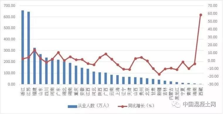 2018年上半年,全國建筑業(yè)從業(yè)人數(shù)超過百萬的地區(qū)共15個(gè)。浙江、江蘇依然是從業(yè)人數(shù)大省,人數(shù)分別達(dá)到658.04萬人和643.60萬人。福建、山東、四川、河南、廣東、湖北等6省從業(yè)人數(shù)均超過200萬人。與上年同期相比,16個(gè)地區(qū)的從業(yè)人數(shù)增加,其中,增加人數(shù)最多的是福建,增加38.15萬人;15個(gè)地區(qū)的從業(yè)人數(shù)減少,其中,減少最多的是新疆,減少8.76萬人。從業(yè)人數(shù)增幅最大的是西藏,達(dá)到58.09%;增幅最小的是新疆,下降了17.44%(圖5)。
