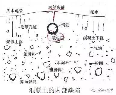 混凝土拌合物在攪拌后混合均勻,骨料下沉,混凝土中的游離水和輕物質(zhì)上浮、氣泡逸出,泌出的水分在混凝土表面聚集,這是混凝土拌合物的保水性(粘聚性)不好,這個(gè)過程會在混凝土內(nèi)部形成較多的缺陷,如: