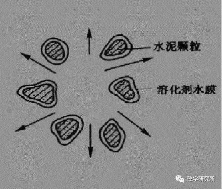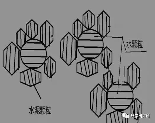 種水泥拌合物狀態(tài)為工地常見狀態(tài),也就是說一個(gè)水顆粒被N多的這個(gè)水泥顆粒包裹著。那么水泥顆粒與水泥顆粒之間有非常大的這個(gè)電子吸附效應(yīng),還有內(nèi)摩角度。這樣同等用水量情況下混凝土看上去比較干燥,并且流動性不佳。