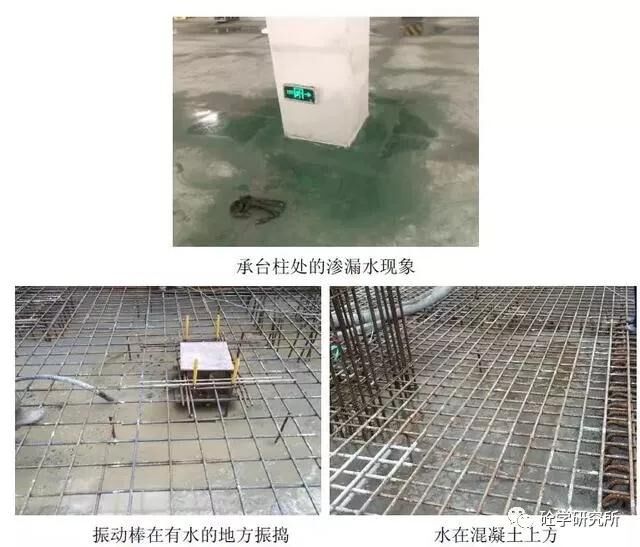 在工程實(shí)踐中,如積水未抽除,這些積水一部分會被混凝土吸收,從混凝土內(nèi)部由下向上泌出,成為天然的泌水,成為后期“點(diǎn)”滲漏的薄弱環(huán)節(jié),如承臺處,積水可能會順著柱鋼筋向上泌出,在鋼筋附近形成由下向上的滲水通道,成為后期滲漏水的薄弱環(huán)節(jié);