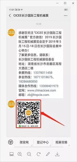 第1步,掃碼關(guān)注“CICEE長沙國際工程機(jī)械展”微信公眾號,點擊“參會登記”,獲取小程序二維碼。