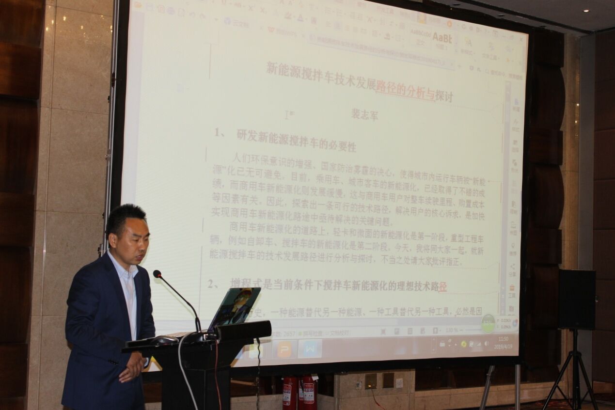 安徽星馬專用汽車有限公司總經(jīng)理助理裴志軍先生從國內(nèi)外攪拌車的發(fā)展現(xiàn)狀出發(fā),作了“增程式是當(dāng)前條件下攪拌車新能源化的理想技術(shù)路徑”和“增程式在攪拌車上應(yīng)用前景展望”的《新能源攪拌車技術(shù)發(fā)展路徑的分析與探討》報(bào)告。