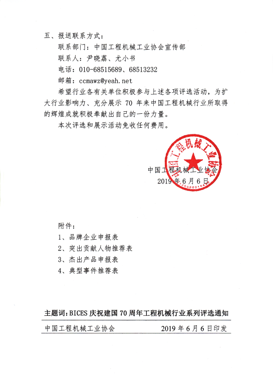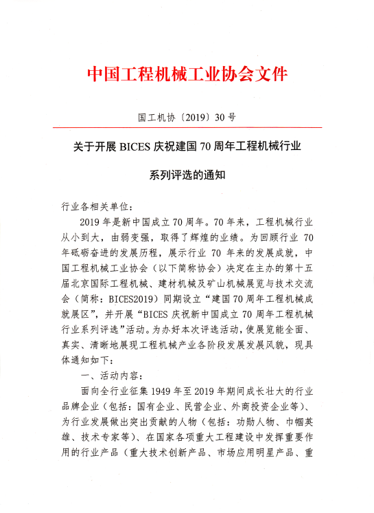 關(guān)于開展BICES慶祝建國(guó)70周年工程機(jī)械系列行業(yè)評(píng)選的通知