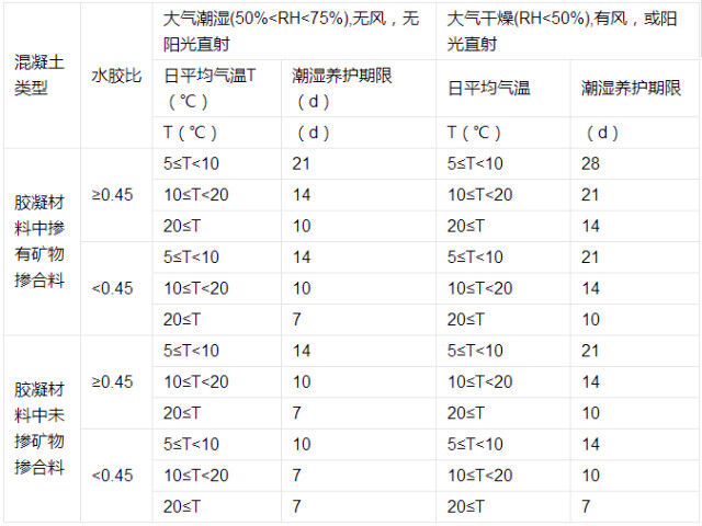 (3)養(yǎng)護持續(xù)時間以規(guī)范中所規(guī)定的時間為最短時間,豎向混凝土結(jié)構(gòu)適當增加養(yǎng)護時間,結(jié)合混凝土的組成及配合比、環(huán)境溫度與濕度、養(yǎng)護方法、風力、風速等諸多因素綜合考慮。