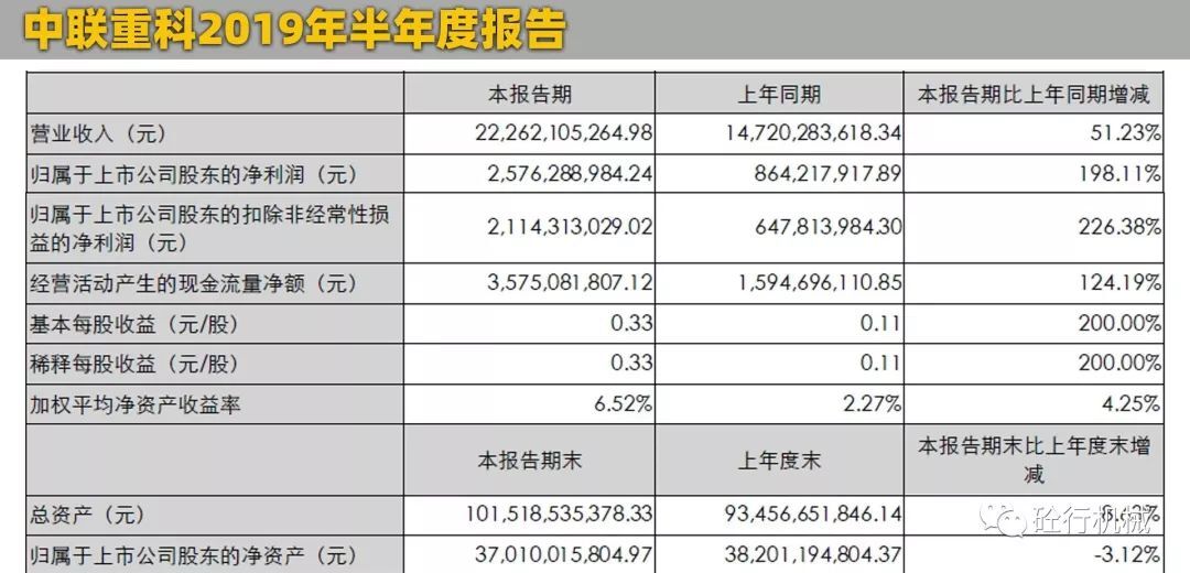8月29日晚,三一重工官方發(fā)布了其2019年上半年業(yè)績(jī)公告。上半年,公司實(shí)現(xiàn)營(yíng)業(yè)總收入433.86億元,同比增長(zhǎng)54.27%;包括三一國(guó)際銷(xiāo)售收入70.26億元,同比增長(zhǎng)15.34%。歸屬于上市公司股東的凈利潤(rùn)67.48億元,同比增長(zhǎng)99.14%。對(duì)比之下,不管是營(yíng)收能力,還是賺錢(qián)能力,三一重工都是最強(qiáng)的,凈利潤(rùn)更是比徐工和中聯(lián)凈利潤(rùn)的總和還要多將近一倍,民營(yíng)重工第一品牌當(dāng)之無(wú)愧。