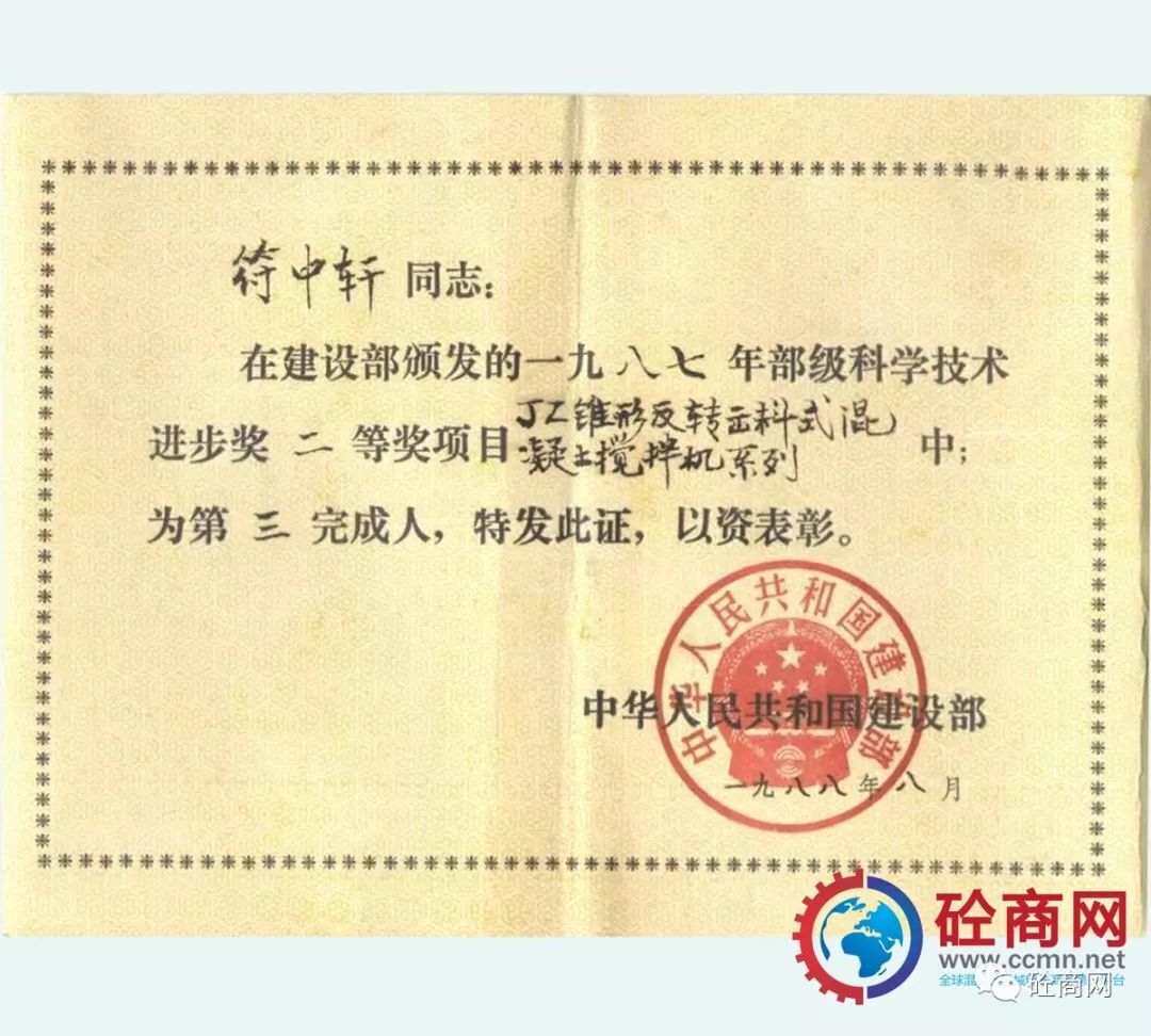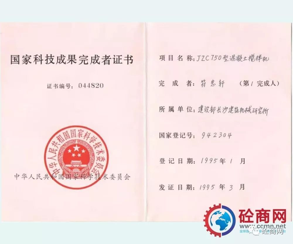 通過(guò)全行業(yè)的不懈努力,改革統(tǒng)型機(jī)型的結(jié)構(gòu)與技術(shù),新型混凝土攪拌機(jī)取得了突飛猛進(jìn)的發(fā)展,并在全國(guó)推廣使用,獲得用戶(hù)廣泛的認(rèn)可與好評(píng)。長(zhǎng)沙建機(jī)院負(fù)責(zé)的、本人作為主要參與設(shè)計(jì)者的“JZ錐形反轉(zhuǎn)出料攪拌機(jī)系列”獲建設(shè)部1987年科技進(jìn)步二等獎(jiǎng);代表長(zhǎng)沙建機(jī)所與方圓集團(tuán)合作開(kāi)發(fā)的JZC750混凝土攪拌機(jī),獲得國(guó)家科技成果證書(shū)。