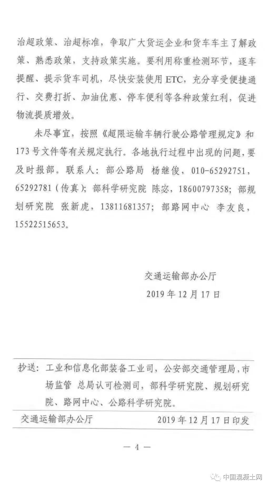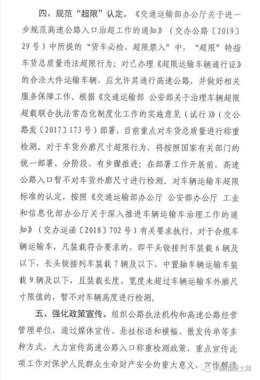 一、嚴(yán)格執(zhí)行全國統(tǒng)一的違法超限超載認(rèn)定標(biāo)準(zhǔn)。嚴(yán)格按照《交通運輸部 公安部關(guān)于治理車輛超限超開車聯(lián)合執(zhí)法常態(tài)化制度化工作的實施意見 (試行)》(交公路發(fā)【2017】173號)規(guī)定的《公路貨運車輛超限超載認(rèn)定標(biāo)準(zhǔn)》執(zhí)行,嚴(yán)禁隨意提高或者降低認(rèn)定標(biāo)準(zhǔn)。其中,六軸列車驅(qū)動形式為6×4的總質(zhì)量限值為49噸,驅(qū)動形式為6×2的總質(zhì)量限值為46噸。各地不得因驅(qū)動形式為6×4人列車未辦理ETC而簡單按照46噸處理,不得簡化宣傳,出現(xiàn)如“貨車最大總質(zhì)量限定為46噸”宣傳標(biāo)語,造成公眾誤解。對驅(qū)動軸為每軸每則雙輪胎且裝備空氣懸架的3軸、車軸貨車以及4軸鉸接列車總質(zhì)量限值各增加1噸。二、統(tǒng)一合理誤差控制標(biāo)準(zhǔn)。考慮到稱重檢測設(shè)施(設(shè)備)在使用過程中可能出現(xiàn)一定的誤差,對于貨車稱重檢測結(jié)果不大于認(rèn)定標(biāo)準(zhǔn)105%(即超限部分未直如過認(rèn)定標(biāo)準(zhǔn)的5%)的,暫按未超限超載處理。鑒于兩軸貨車數(shù)量多、涉及面廣、情況復(fù)雜。目前,部正在商有關(guān)部門研究制定專項治理方案。在相關(guān)部門統(tǒng)一部署專項治理之前,各地對于車貨總質(zhì)量不超過18噸的兩軸貨車,不得以超限為由禁止其通行高速公路。同時,要做好相關(guān)數(shù)據(jù)的采集與分析工作,為下一步開展專項治理提供支撐。《交通運輸部辦公室廳關(guān)于進(jìn)一步規(guī)范高速公路入口治超工作的通知》(交辦公路【2019】29號)中所提的“貨車必檢,超限禁入”中,“超限”特指車貨總質(zhì)量違法超限行為;對已辦理《超限運輸車輛通行證》的合法大件運輸致車輛,應(yīng)允許其通行高速公路,并做好相關(guān)服務(wù)保障工作。根據(jù)《交通運輸部 公安部關(guān)于治理車輛超限超載聯(lián)合執(zhí)法常態(tài)化制度化工作的實施意見(試行)》(交公路發(fā)【2017】173號)部署,目前重點對車貨總質(zhì)量進(jìn)行稱重檢測。對于車貨外廓尺寸超限行為,將按照國家有關(guān)部門的統(tǒng)一部署,分階段、有步驟推進(jìn);在部署工作開展前,高速公路入口暫不對車貨外廓尺寸進(jìn)行檢測。對車輛運輸超限標(biāo)準(zhǔn)的認(rèn)定,按照《交通運輸 部辦公室廳 公安部辦公室廳 工業(yè)和信息化部辦公室廳關(guān)于深入推進(jìn)車輛運輸車治理工作的通知》(交辦運【2018】702號)有關(guān)要求執(zhí)行,對于合規(guī)車輛運輸車,凡裝載符合要求的,即平頭鉸接列車裝載6輛及以下,長頭鉸接列車裝載7輛及以下,中置軸車輛運輸車裝載9輛及以下,且裝載長度、寬度未超過車輛運輸車外廓尺寸限值的,暫不對車輛高度進(jìn)行檢測。組織公路執(zhí)法機構(gòu)和高速公路經(jīng)營管理單位,通過媒體宣傳、懸掛標(biāo)語和橫幅、散發(fā)傳單等多種方式,大力宣傳高速公路入口稱重檢測政策,重點宣傳此項工作對保護(hù) 人民群眾生命財產(chǎn)安全的重大意義 ,宣傳解讀治超政策、治超標(biāo)準(zhǔn),爭取廣大貨運企業(yè)和貨車車主了解政策、熟悉政策,支持政策實施。要利用稱重檢測環(huán)節(jié),逐車提醒、提示貨車司機,盡快安裝ETC,充分享受便捷通行、交費打折、加油優(yōu)惠、車便利等各種政策紅利,促進(jìn)物流提質(zhì)增效。未盡事宜,按照《超限運輸車輛行駛公路管理規(guī)定》和173號文件等有關(guān)規(guī)定執(zhí)行。各地執(zhí)行過程中出現(xiàn)的要及時報部。全國物流標(biāo)準(zhǔn)非?;靵y,地方標(biāo)準(zhǔn)與國家標(biāo)準(zhǔn)經(jīng)常“打架”,導(dǎo)致全國物流司機苦不堪言,而此次交通廳像各省運輸廳發(fā)布特急文件通知,劍指就是統(tǒng)一運輸車輛載重的標(biāo)準(zhǔn),令運輸行業(yè)向制度化,規(guī)范化過渡。同時從根源上徹底清除“亂收費”現(xiàn)象,并發(fā)布問題反映電話:部科學(xué)研究院:陳宓 18600797358部規(guī)劃院:張新虎 13811681357部路網(wǎng)中心:李友良 15522515653