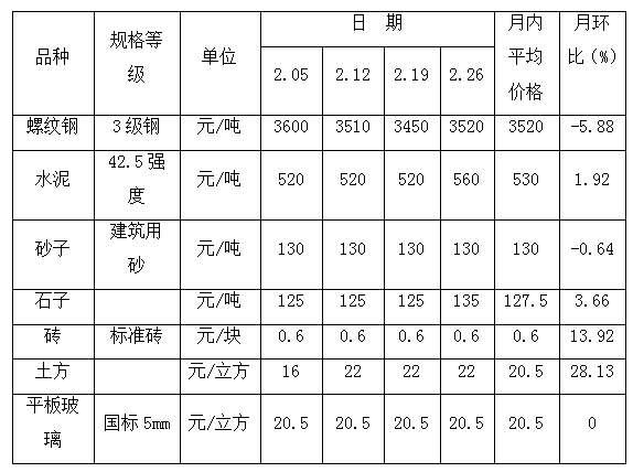 受春節(jié)假期和新冠肺炎疫情影響,2月份山東省濟寧市黃河灘區(qū)遷建物資市場交易量明顯減少,價格變動整體漲跌互現。與上月相比,7種黃河灘遷建物資價格呈4升2降1平態(tài)勢。其中,螺紋鋼的價格震蕩下行,水泥的價格穩(wěn)中有漲,砂子、磚和平板玻璃的價格月內平穩(wěn)運行,石子的價格受季節(jié)性供應減少影響小幅上升,土方的價格呈現高位整理態(tài)勢。螺紋鋼方面,截止到2月26日,濟寧市梁山縣監(jiān)測的螺紋鋼市場批發(fā)價格為3520元/噸,價格下降明顯。由于目前特殊時期,貨運受阻且下游企業(yè)復工進度開展緩慢,短期內需求仍然偏弱,市場整體成交冷清,庫存和資金壓力逐步增加,供給壓力放大,商家對于后市心態(tài)偏空,處于悲觀情緒,市場整體處于有價無市狀態(tài)。