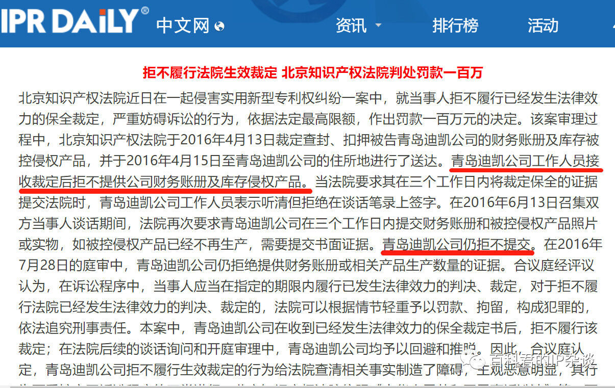 具體點(diǎn)就是,迪凱公司無(wú)正當(dāng)理由,拒絕按照保全裁定提供相關(guān)證據(jù)(甚至還曾被判處罰款100萬(wàn)),應(yīng)當(dāng)承擔(dān)相應(yīng)的不利后果,從而推定上述主張成立。