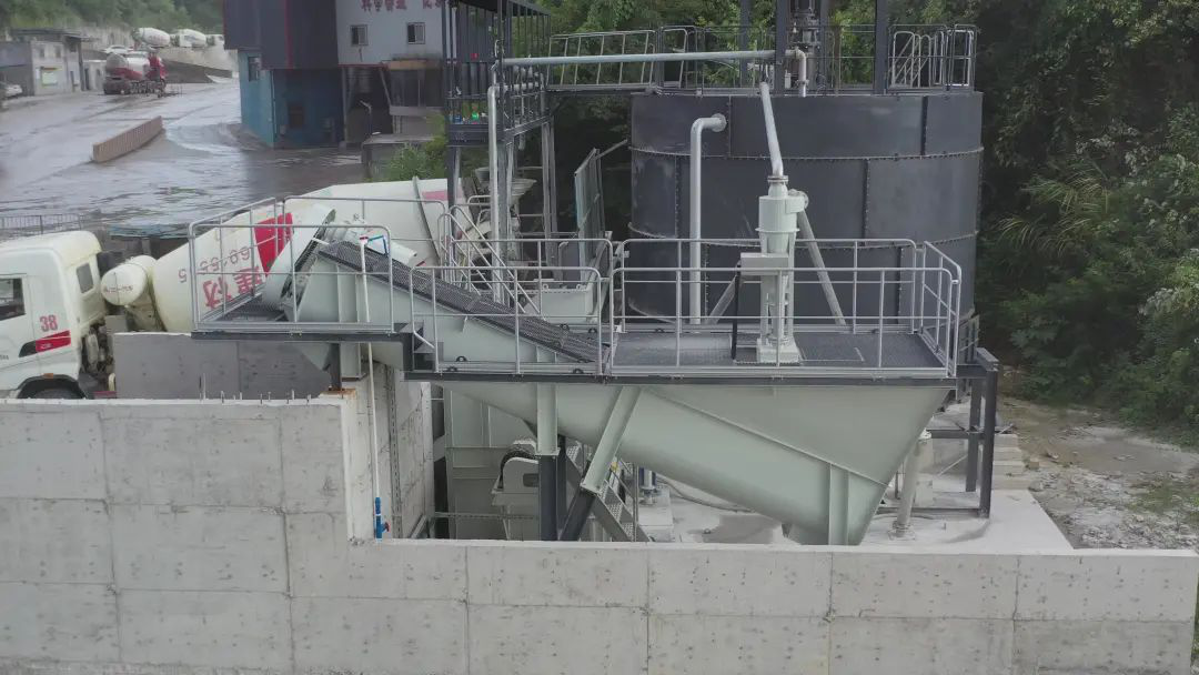 廠區(qū)一角,南方路機(jī)WCRE60設(shè)備一旁地上的漿水罐,具有自動(dòng)排污清污功能,能有效降低漿水濃度,減輕了人工清理成本。設(shè)有定時(shí)攪拌器,定時(shí)啟動(dòng)攪拌器,即可快速將漿水?dāng)嚢杈鶆?,漿水罐有自動(dòng)排污功能,有效地保障了漿水使用后混凝土的安全性。
