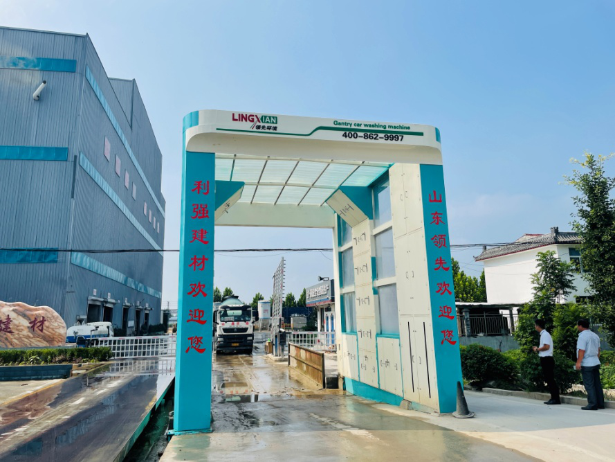 在攪拌站門口設置洗車機,進出車輛分別從側、頂、底部360度無死角沖洗,保證了進出車輛的整潔,避免了對路面的污染,同時防止了車輛行駛產生揚塵污染。