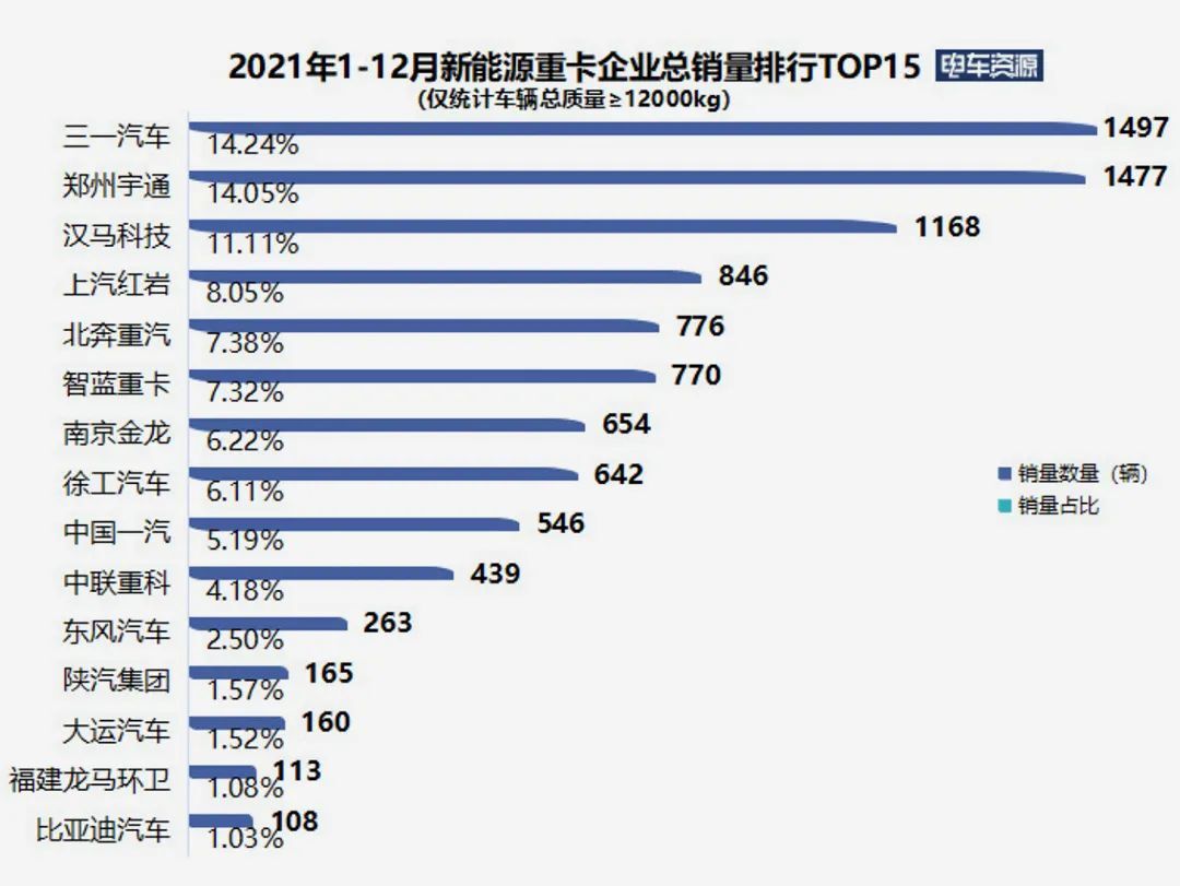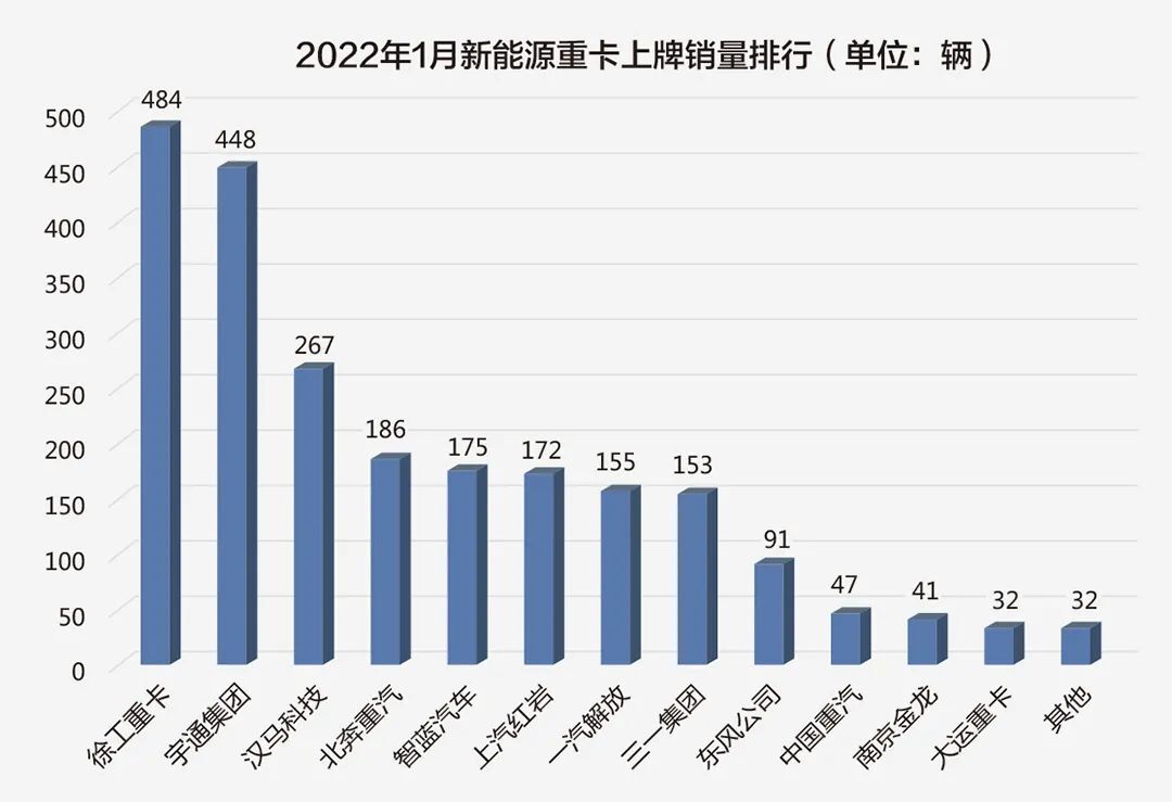 特別是在企業(yè)銷量排行榜上,表現(xiàn)最為搶眼的并不是傳統(tǒng)重卡制造商,而是工程機(jī)械企業(yè)跨行業(yè)進(jìn)軍重卡行業(yè)的典型代表——三一汽車與徐工汽車:三一新能源重卡2021年累計銷量達(dá)到1497輛,同比大增1621%,市場份額達(dá)到14.33%,較上年同期提升了11個百分點(diǎn);徐工在2022年1月21.2%的月度占有率火熱開局,問鼎新能源重卡2022首月銷冠。