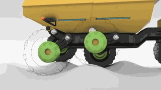 Centaur鉸接式卡車具備強(qiáng)大的裝載能力,其載重能力或?qū)⒊^(guò)40噸,巨大的輪胎和堅(jiān)固的底盤支撐起了這只龐然大物。Centaur鉸卡采用了非常獨(dú)特的懸掛設(shè)計(jì),6個(gè)輪胎分別獨(dú)立地與主軸連接,連接處可以自由轉(zhuǎn)動(dòng),這使得Centaur在坎坷不平的路面上如履平地。
