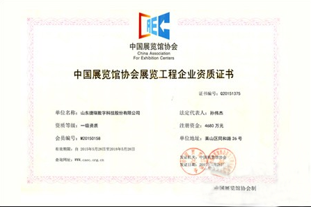 2015年5月28日,山東捷瑞數(shù)字科技股份有限公司順利通過中國展覽館協(xié)會(huì)的審核,正式被認(rèn)定為中國展覽展示行業(yè)最高資質(zhì):展覽工程企業(yè)一級(jí)資質(zhì),并獲得中國展覽館協(xié)會(huì)頒發(fā)的資質(zhì)證書。