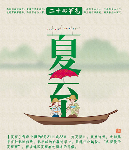 夏至是二十四節(jié)氣中最早被確定的一個節(jié)氣。公元前七世紀,先人采用土圭測日影,就確定了夏至。每年的夏至從6月21日(或22日)開始,至7月7日(或8日)結(jié)束。據(jù)《恪遵憲度抄本》:“日北至,日長之至,日影短至,故曰夏至。至者,極也?!毕闹吝@天,太陽直射地面的位置到達一年的最北端,幾乎直射北回歸線(北緯23°26\'),北半球的白晝達最長,且越往北晝越長。如海南的??谑羞@天的日長約13小時多一點,杭州市為14小時,北京約15小時,而黑龍江的漠河則可達17小時以上。夏至以后,太陽直射地面的位置逐漸南移,北半球的白晝?nèi)諠u縮短。民間有“吃過夏至面,一天短一線”的說法。而此時南半球正值隆冬。