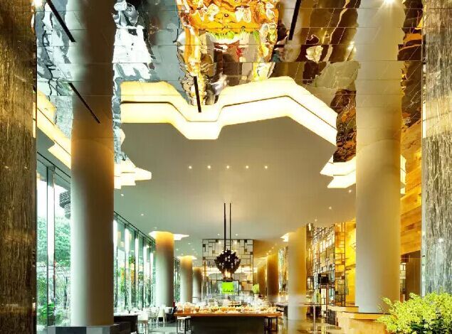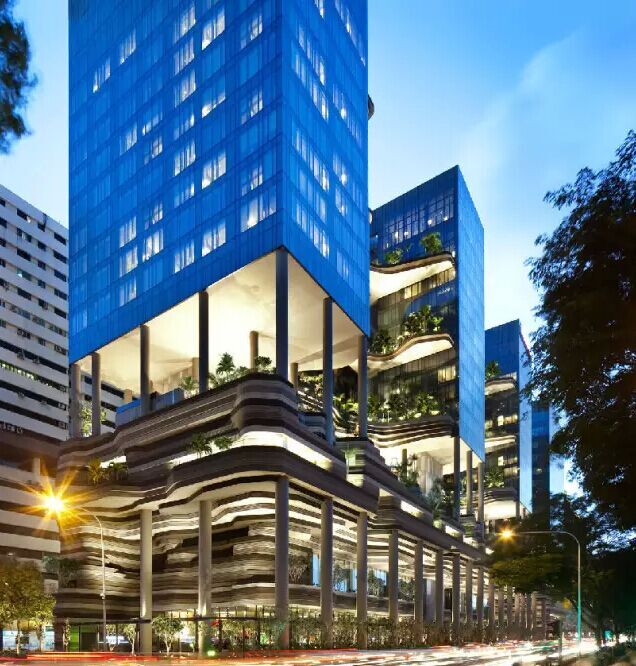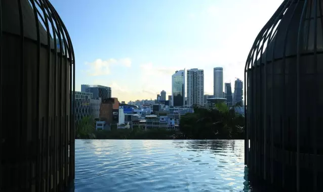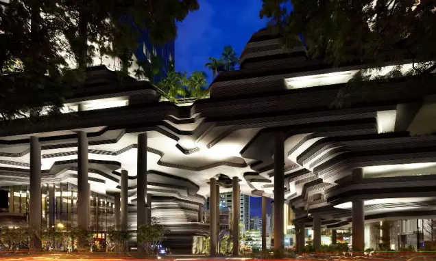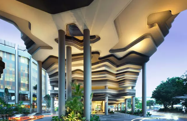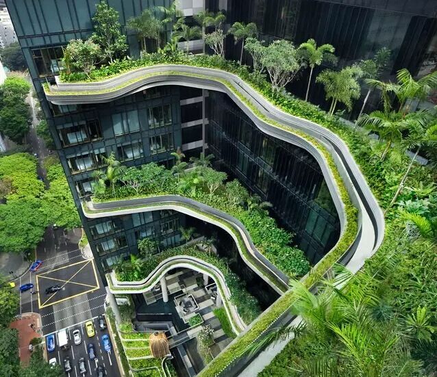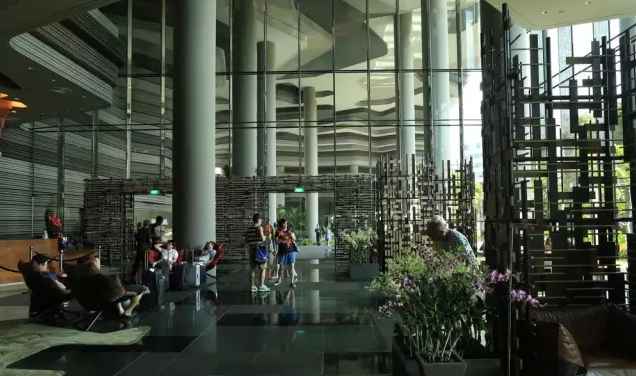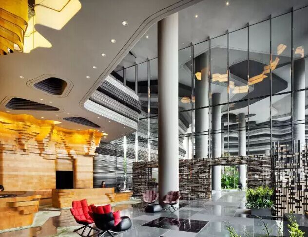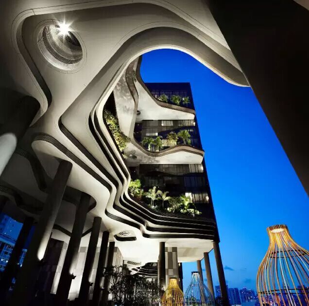 建筑流動的幾何體給人一種高聳入云之感,塔樓每隔三層客房擁有懸挑的空中花園,上面種滿了熱帶植物,它已成為城市綠地的一部分,與鄰近公園融為一體。酒店擁有自我遮陽功能,懸挑而出的空中花園和相鄰的三座酒店客房大樓都能起到遮陽的作用,客房樓層立面采用低輻射玻璃。酒店頂樓的屋頂花園可將全城風(fēng)光一覽無余,獨(dú)家蘭花貴賓會所位處該層,并配有私人會議空間、圖書館和專用的貴賓會所門房。酒店五層設(shè)有可俯瞰城市的無邊界泳池,設(shè)備先進(jìn)的健身中心,特色的鳥籠休息涼亭及長達(dá)300米花園走道。