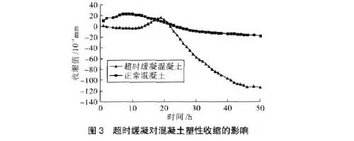 試驗(yàn)以C30混凝土為研究對象,采用CABR-NES型非接觸式混凝土收縮變形測定儀,對比研究超時緩凝對混凝土塑性收縮的影響,試驗(yàn)結(jié)果見圖3。