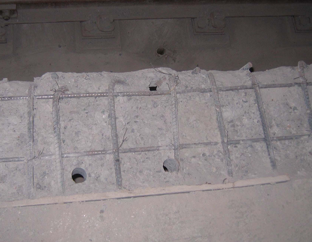 鑿除孔洞周圍松散混凝土,用高壓水沖洗干凈,立模后用高一強(qiáng)度等級的細(xì)石混凝土仔細(xì)澆筑搗固。