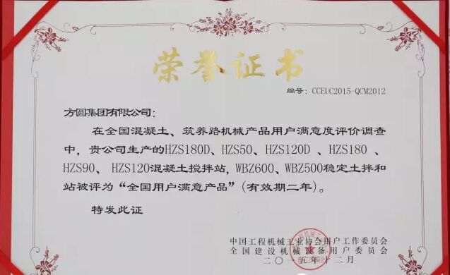 方圓集團憑借在售后服務(wù)領(lǐng)域的突出表現(xiàn),榮獲“用戶滿意服務(wù)單位”的稱號,同時,方圓集團生產(chǎn)的HZS180D、HZS50、HZS120D、HZS180、HZS90、HZS120型混凝土攪拌站,WBZ600、WBZ500型穩(wěn)定土拌和站被評為“全國用戶滿意產(chǎn)品”。