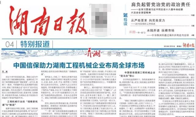 近日,《湖南日?qǐng)?bào)》專版刊登了宣傳報(bào)道《中國(guó)信保助力湖南工程機(jī)械企業(yè)布局全球市場(chǎng)》。報(bào)道肯定了中國(guó)信保在履行政策性職能方面取得的成效,并介紹了中國(guó)信保長(zhǎng)沙營(yíng)管部在支持湖南省工程機(jī)械行業(yè)企業(yè)更好地“走出去”所采取的措施。報(bào)道詳情如下: