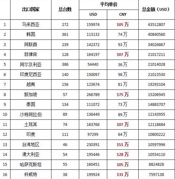 2015年1—11月我國塔機(jī)出口3098臺,同比減少14.68%,出口金額達(dá)到39303.24萬美元,同比減少6.95%,預(yù)計全年出口3300臺左右,相比國內(nèi)市場接近50%的銷量跌幅,塔機(jī)出口成績可嘉。尤其2015年上半年相比去年同期增長了16.7%,但從7月份開始逐月走低。從近10年的區(qū)域占比來看,中國塔機(jī)出口的市場一直由亞太地區(qū)市場占據(jù)絕對主力,從近三年的數(shù)據(jù)可以看出,雖然歷年各國排名都有變化,但除了俄羅斯聯(lián)邦、土耳其、巴西、阿爾及利亞等國家外,其他列于榜單中的國家全部位于亞洲區(qū)域,顯而易見,我國塔機(jī)出口主要市場依舊是亞洲等發(fā)展中國家。(具體參見下圖:2015年1—11月塔機(jī)出口數(shù)據(jù))
