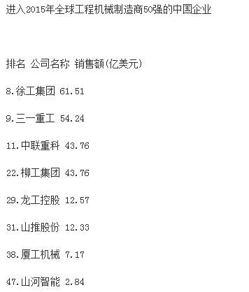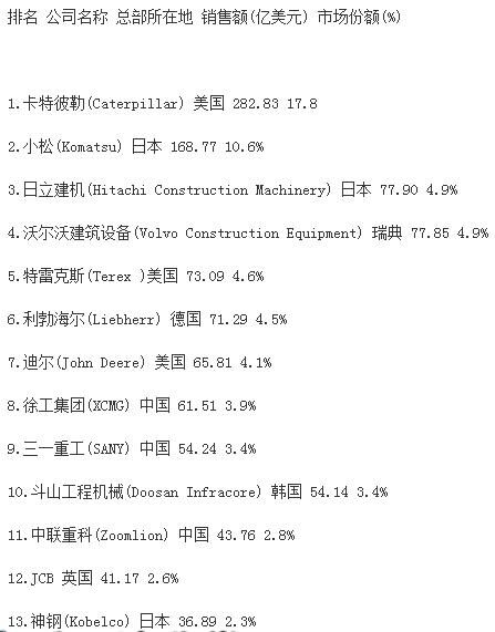 分析指出,受大宗商品價(jià)格下跌、新型經(jīng)濟(jì)體經(jīng)濟(jì)增速減緩和世界經(jīng)濟(jì)不景氣的影響,全球前50家工程機(jī)械制造企業(yè)總產(chǎn)值較上一年度下跌16.2%,達(dá)到1330億美元,創(chuàng)2009年以來新低。據(jù)中國工程機(jī)械商貿(mào)網(wǎng)編輯了解,2009年,工程機(jī)械行業(yè)一年銷售額下降了1090億美元。自那時(shí)起,工程機(jī)械行業(yè)收入下降趨勢一直未有改變。報(bào)告同時(shí)強(qiáng)調(diào),榜單上下滑最為嚴(yán)重的是中國企業(yè),這很大程度上是因?yàn)橹袊?jīng)濟(jì)增速的放緩。中國企業(yè)中,只有徐工集團(tuán)仍然保持在前十強(qiáng),位列榜單第九位?!斑@個(gè)市場趨勢表現(xiàn)最顯著的就是中國建筑設(shè)備制造商,相比去年,所有中國企業(yè)的排名有所下滑。排名前十的企業(yè)中,如今只有徐工一家中國工程機(jī)械制造廠商?!?/span>