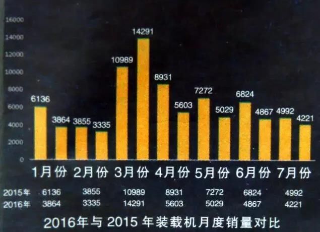 據(jù)公布的數(shù)據(jù),7月份全國26家主要裝載機生產(chǎn)企業(yè)共銷售各類裝載機4221臺,同比2015年7月份的4992臺,下降15.44%;環(huán)比6月份的4867臺,下降13.27%。其中3噸及以上裝載機銷量為3796臺,3噸以下小型裝載機銷量為425臺。從細(xì)分類型來看,3噸及5噸裝載機為主力銷售機型,合計銷量占比達(dá)到80%。綜合來看前7月銷量,除3月份曇花一現(xiàn)般同比大幅增長30.05%外,其余月份裝載機銷量均在下滑。但一個積極的現(xiàn)象是,4月份以來裝載機雖持續(xù)下滑,但降幅一直在收窄,自4月份的37.26%收窄到7月份的15.44%。