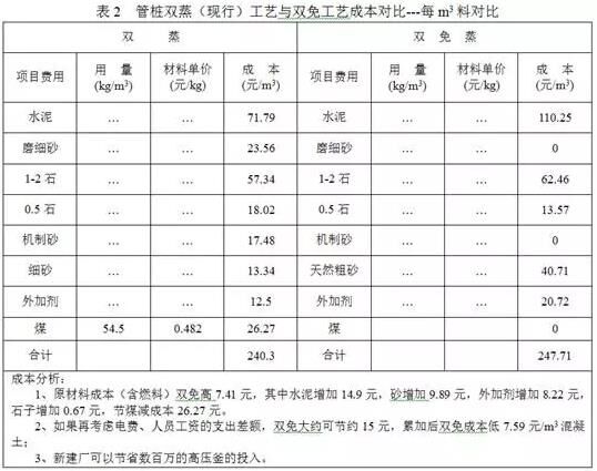 單單從混凝土原材料來看,“雙免”工藝比傳統(tǒng)“雙蒸”工藝高。如果考慮節(jié)省的燃料費用和“雙蒸”工藝的電力費用、人工工資支出差額,則“雙免”工藝比傳統(tǒng)“雙蒸”工藝可以節(jié)省成本7.59元/m3混凝土,而且完全滿足了環(huán)保要求。下表是成本分析對照表。