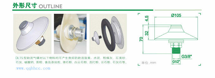 助流氣蝶前部是多孔金屬,外部通入的高壓空氣,經(jīng)過(guò)氣嘴后均勻分散在氣嘴周圍,促使粉料流動(dòng),達(dá)到助流效果。流化效果由氣嘴數(shù)量確定,不同的粉料及容器狀況需要不同數(shù)量的氣嘴。本產(chǎn)品具有安裝維護(hù)方便,價(jià)格低廉、流化效果明顯等突出優(yōu)點(diǎn)。 是水泥倉(cāng)頂除塵器,攪拌站倉(cāng)頂除塵器,以及水泥罐倉(cāng)頂除塵器重要元件。