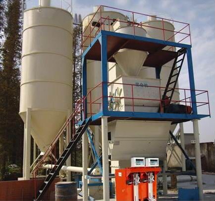 騰飛集團膩子粉生產設備年產兩到三萬噸左右的膩子粉生產設備,一般情況下會用到4-6個原料罐,其中兩個大罐用于裝放散裝水泥和粉煤灰,其余小罐用于裝放輕鈣、 重鈣、砂、小料等。散裝水泥和粉煤灰進罐不需要提升設備,依靠泵車打入。輕鈣、重鈣、砂、小料等需要使用斗式提升機提入小罐,巧妙的物料分配系統(tǒng)支持一個斗式提升機分配式作業(yè),從而避免了資源浪費。