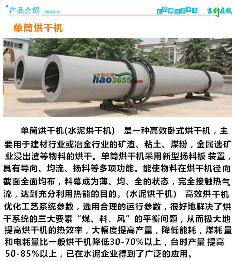 單筒烘干機φ3×25,也叫滾筒干燥機,它廣泛用于建材、冶金、化工、水泥工業(yè)烘干礦渣石灰石、煤粉、礦渣、粘土等物料。該機主要由回轉(zhuǎn)體、揚料板,傳動裝置,支撐裝置及密封圈等部件組成。具有結(jié)構(gòu)合理,制作精良,產(chǎn)量高,能耗低,運轉(zhuǎn)方便等優(yōu)點。
