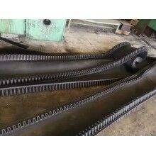 大傾角擋邊輸送帶的基帶是由上覆蓋膠、下覆蓋膠、帶芯和橫向剛性層四部分組成。上覆蓋膠厚度一般為3-6mm;下覆蓋膠厚度一般為1.5-4.5mm,帶芯材料承受拉力,其材料可以是棉帆布(CC)、尼龍帆布(NN)、聚酯帆布(EP)或鋼繩芯(ST)。為了增加基帶的橫行剛性,在芯體上下添加特殊加強層,稱橫向剛性層。基帶的寬度規(guī)格,與普通膠帶相同,符合GB7984-2001的標準規(guī)定。