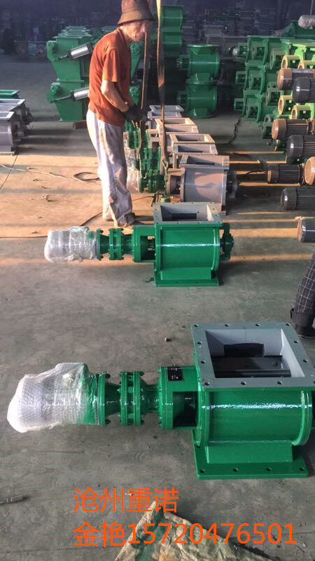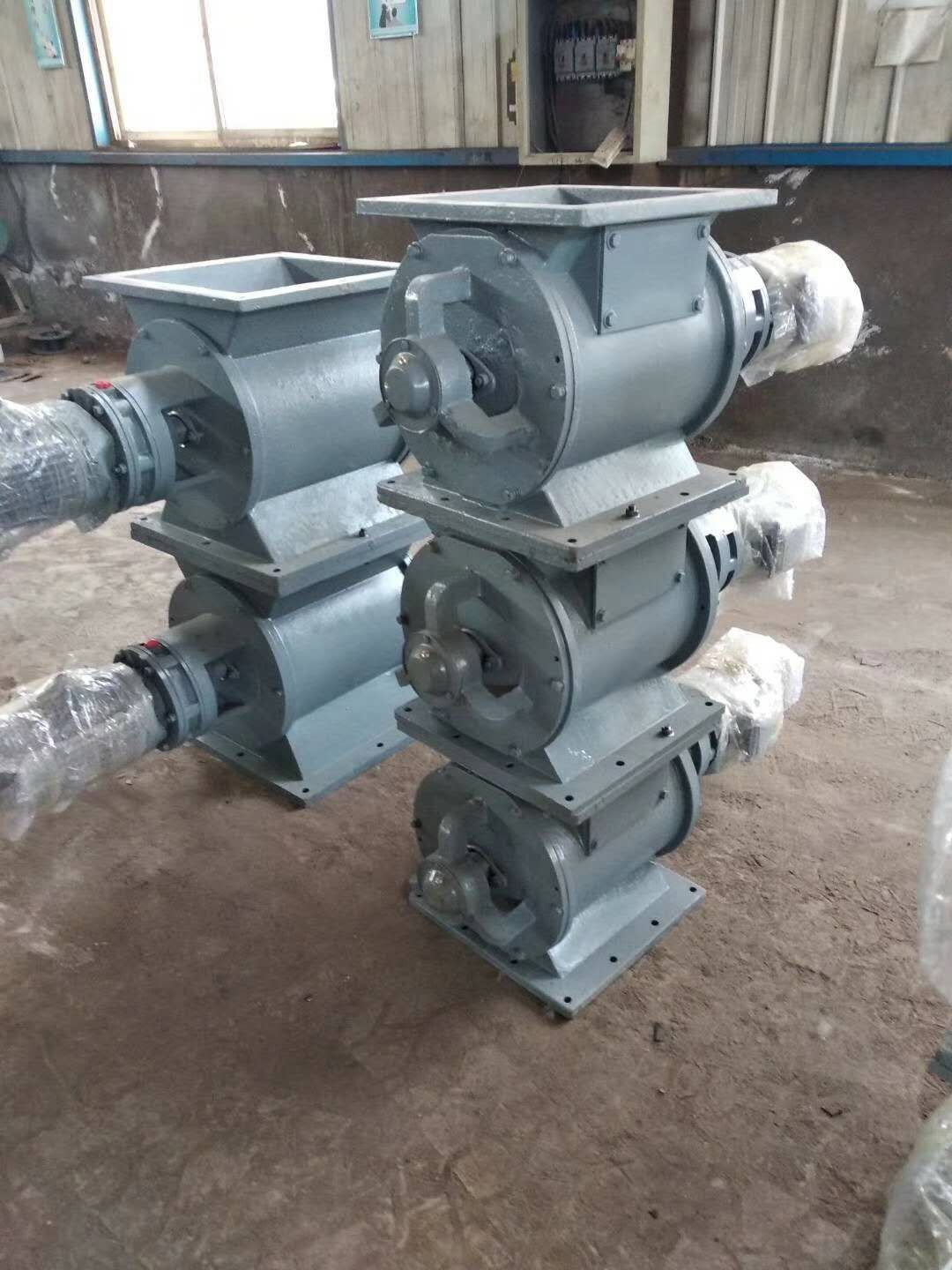 工作原理:星型卸料器工作時(shí),粉塵靠重力落入,充滿上面和側(cè)面的星形葉片空格。葉片轉(zhuǎn)子由電動(dòng)機(jī)通過(guò)減速機(jī)轉(zhuǎn)動(dòng)軸帶動(dòng),葉輪轉(zhuǎn)到下部粉塵靠自重卸下。這種卸塵器一般都安裝在除塵器灰斗下部,為保證連接處的嚴(yán)密不漏風(fēng),在回轉(zhuǎn)卸料器的上部應(yīng)經(jīng)常保持(儲(chǔ)存)一定高度的粉塵。因?yàn)槿~輪轉(zhuǎn)動(dòng)時(shí),卸完粉塵后葉輪轉(zhuǎn)上的那一面經(jīng)常是沒(méi)有粉塵的,所以容易使空氣漏入。為了保持一定高度的灰柱,而且不致卸空,*在灰斗內(nèi)裝設(shè)料位信號(hào)設(shè)施,并與卸塵閥的電動(dòng)機(jī)建立連鎖。